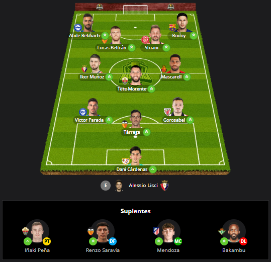 TETE MORENTE: Lo dicho, El TETE está de vuelta. Partido difícil, eso sí, pero parece que Sarabia le está dando confianza y se ha ganado la titularidad. Por el precio que tiene y la posibilidad de usarlo tanto de MC como de DL, merece la pena tenerlo en plantilla.